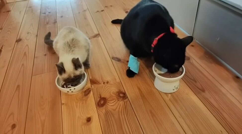退院後、猫ちゃんに課せられた最初のミッションは先住猫たちへの挨拶。全員に挨拶し終わった後は、みんなと一緒にご飯を食べました。