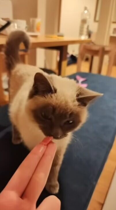 日が経つにつれ、猫ちゃんは徐々に同居猫ちゃんたちや家での暮らしに慣れていったそう。飼い主さんに甘えるようにもなりました。家猫になって覚えたのは、お刺身のおいしさ。