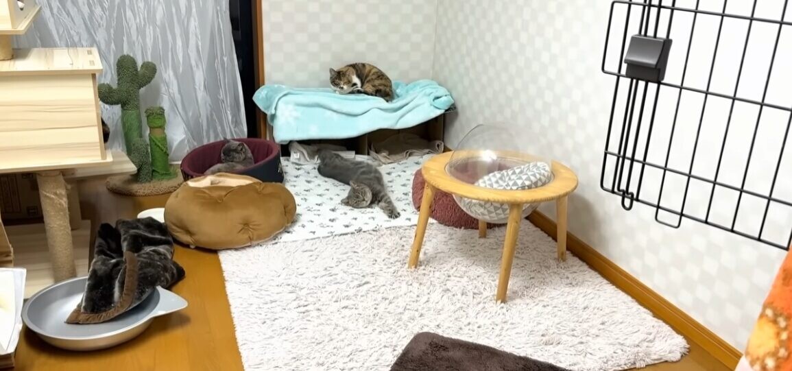 伸び伸び伸び過ごせる部屋を設けると、猫ちゃんたちは部屋を探索したり、伸びをして生まれて初めて太陽の光を浴びたりと、自由に行動。ふかふかな毛布の上でくつろいでもくれました。
