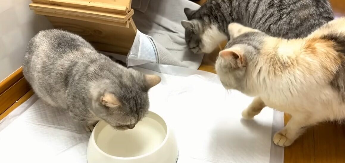 猫ちゃんたちは酷い水分制限があったからか、水への執着心が強く、誰かが水を飲んでいると、飲み水を奪おうとすることも。