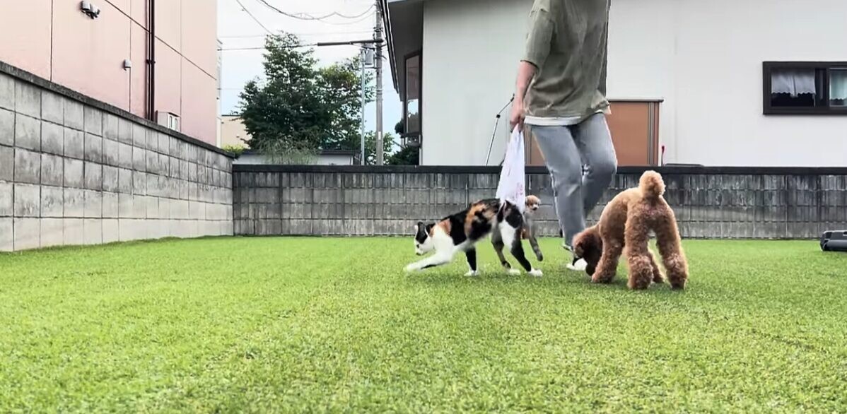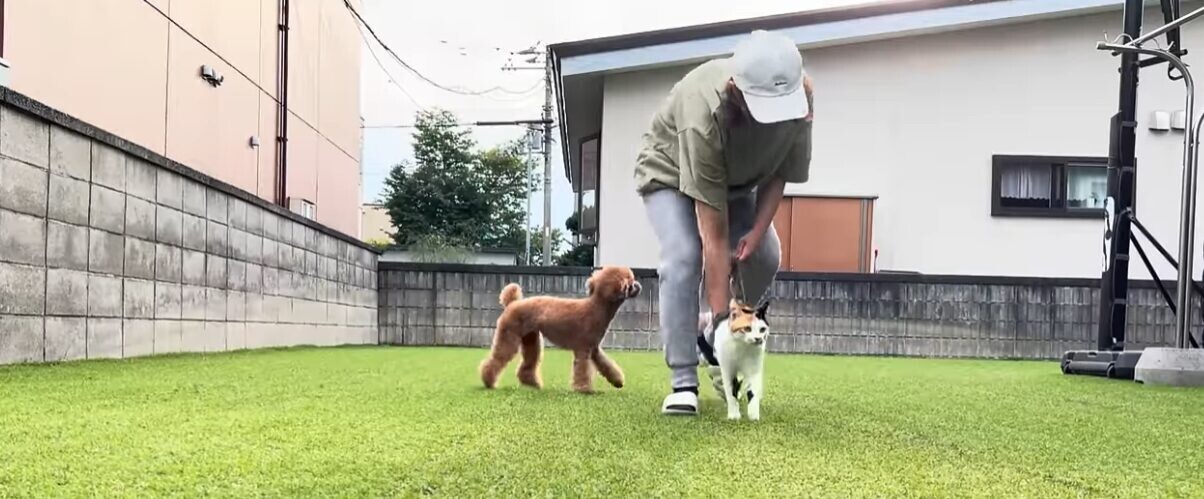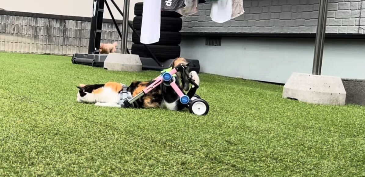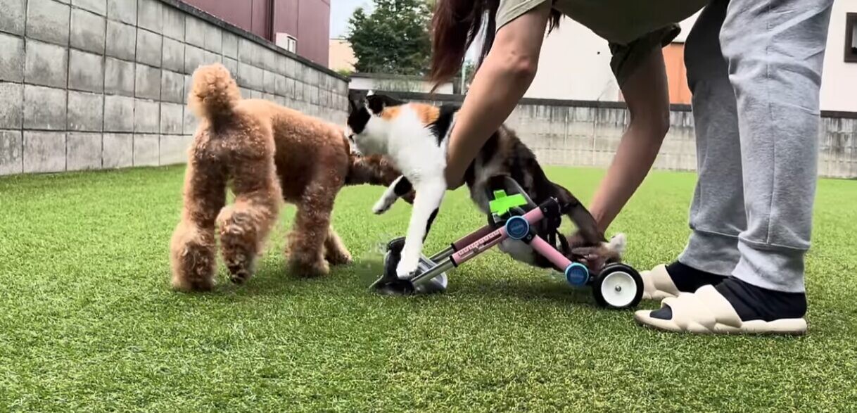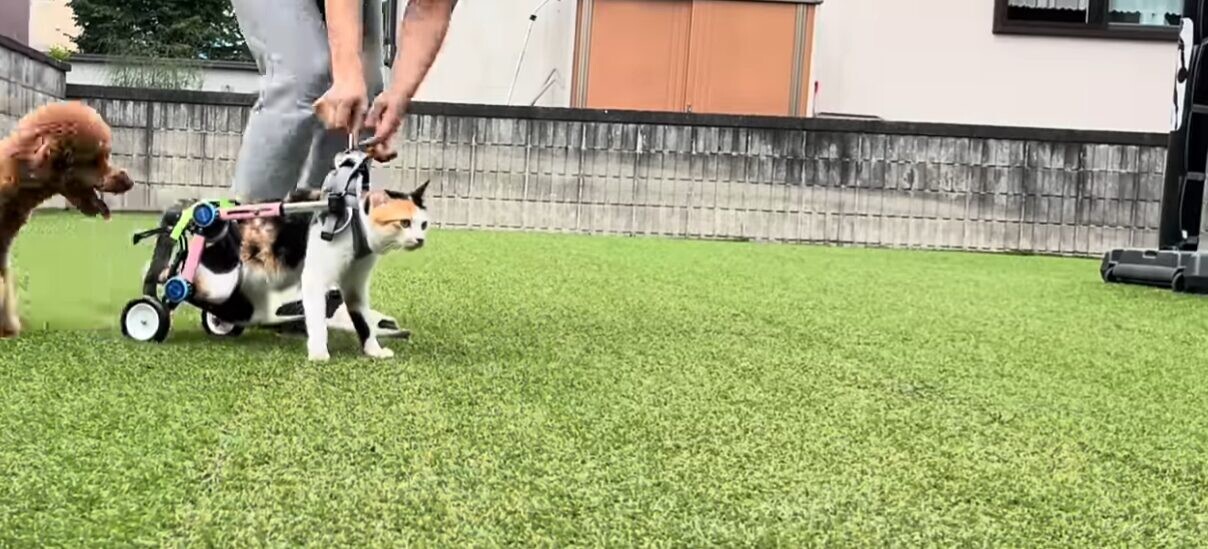 ミィちゃんが快適に使えるように、ハーネス部分を改良しよう。そう決意すると同時に、飼い主さんはいつも行っている、手ぬぐいで動かない後ろ足を持ち上げてミィちゃんを支えるという方法を実行。改めて、庭遊びを楽しんでもらいました。