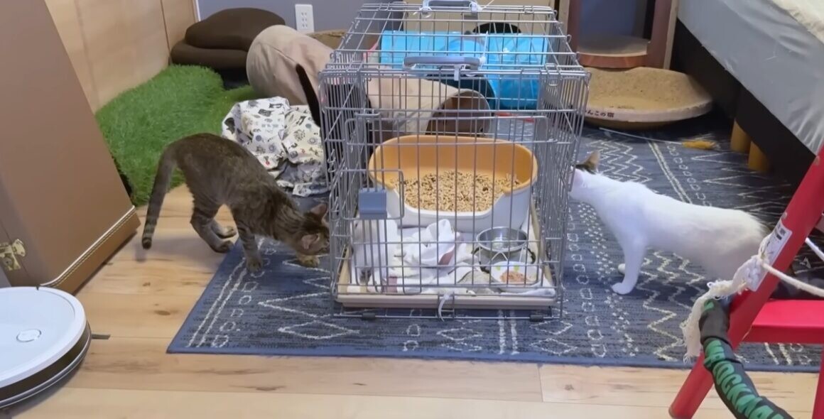 お部屋の探索後はケージ越しに、先住猫の預かり猫たちとご対面です。みな月齢が幼いからか、初めての対面は穏やかなまま終わりました。