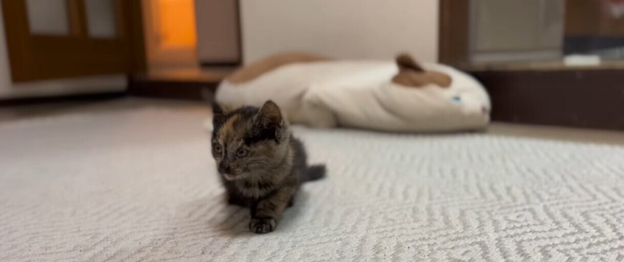 子猫は、生後2ヶ月ほど。不安なようで、尻尾を下げたまま時折、力なく「ニャー」と鳴きます。家族は、「くるみ」という名前をプレゼント。万が一に備え、目を離さないよう、全員で協力しました。