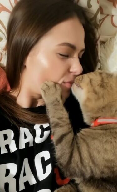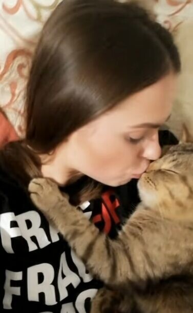 小さな命が愛しくてたまらず、飼い主さんは目を閉じている猫ちゃんに優しくキス。愛あるキスを2回も贈りました。