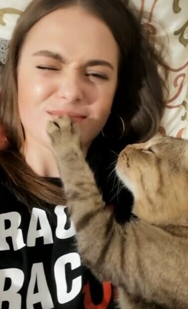 また、猫ちゃんは求愛に応えてくれた後も飼い主さんの口を手で押さえてキスをおねだり。かわいい仕草を見た飼い主さんは、猫ちゃんにキスの嵐!