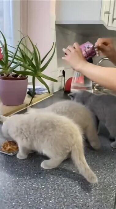 ご飯の準備を始めると、子猫たちはソワソワ。キッチンに集まり、食事の時間を待ち始めます。