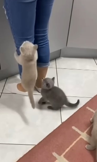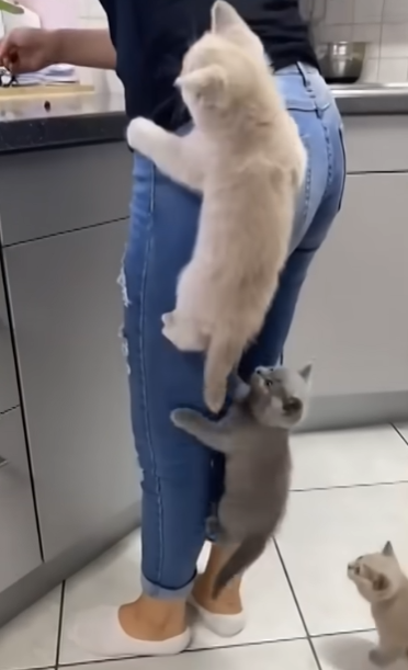 こうなると、そばで大人しく待っていた子猫にも変化が…。2匹に続き、飼い主さんの体にしがみつき、ご飯ゲットを目指します。