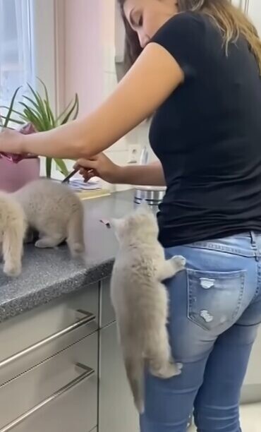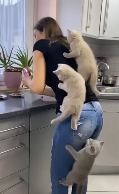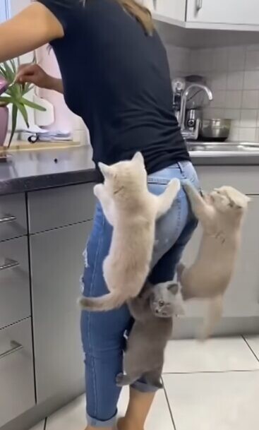 ご飯の時間を待ちわびる子猫の姿には、キュンキュンさせられるものです。こちらのお宅では3匹の子猫がご飯を待ちきれず、猛アピール!飼い主さんの体に登って催促をし始めました!