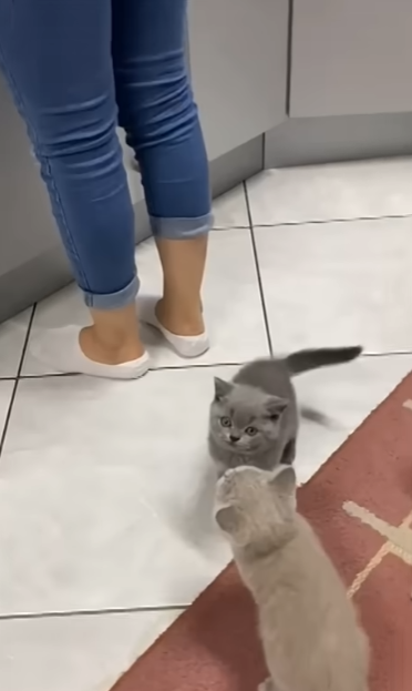 すると、その姿を見ていた子猫も同じ行動に!先頭を切る子猫に続き、飼い主さんの体を登り始めました。