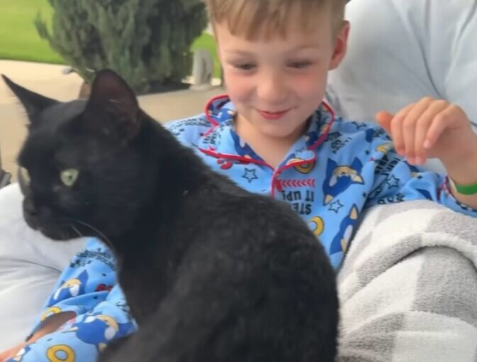 家に入ると、猫ちゃんは息子さんにご挨拶。自ら近寄り、スキンシップを求めます。そんな愛くるしい姿に、息子さんは思わず笑顔に。
