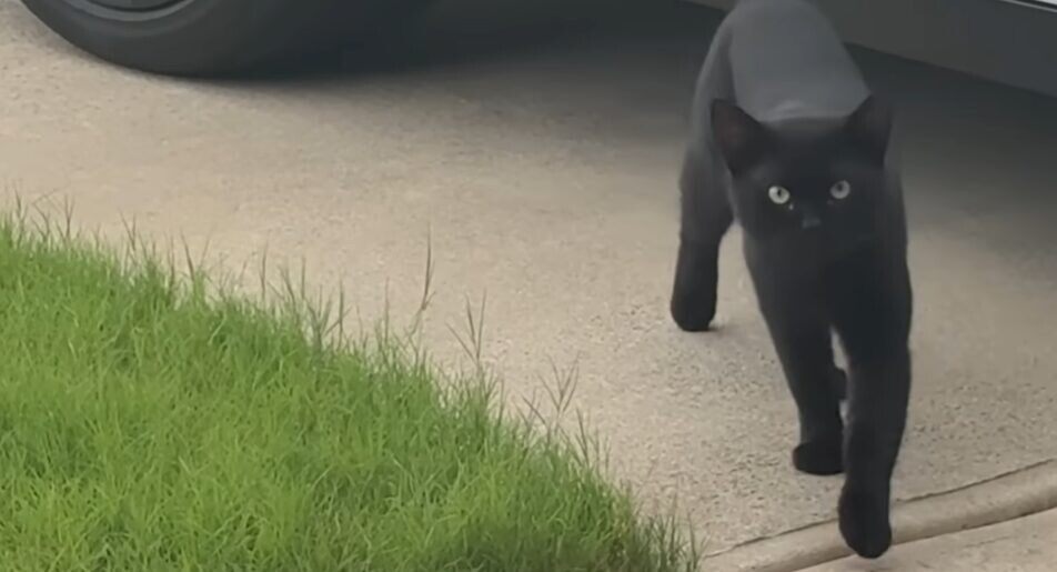 野良猫らしき猫ちゃんは飼い主さんが猫の鳴き声をマネすると、「ニャー」とお返事。警戒心を見せることなく、近づいてきました。