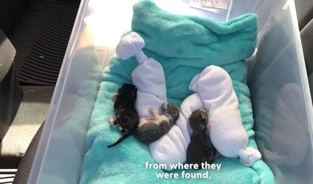 子猫たちは生後間もなく、まだ目も開いていませんでした。女性は自分の体温はもちろん、車の暖房も使って子猫たちを温めながら帰宅。