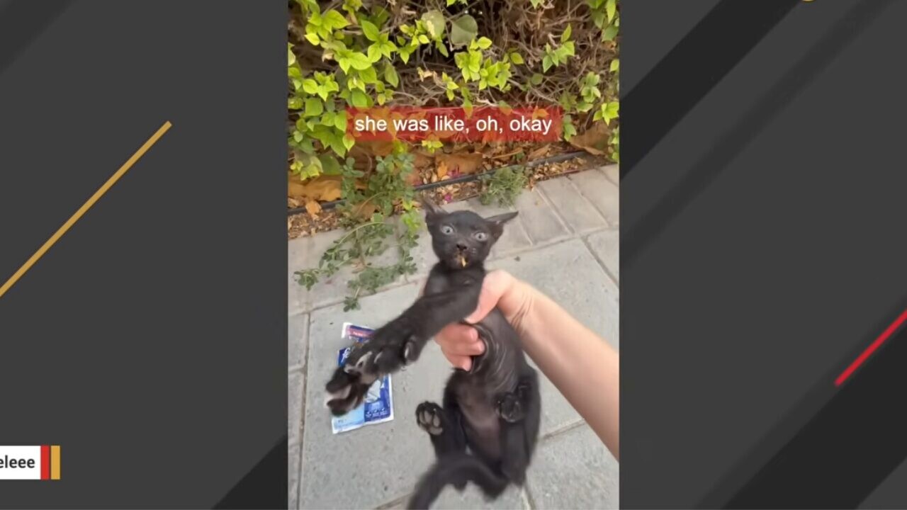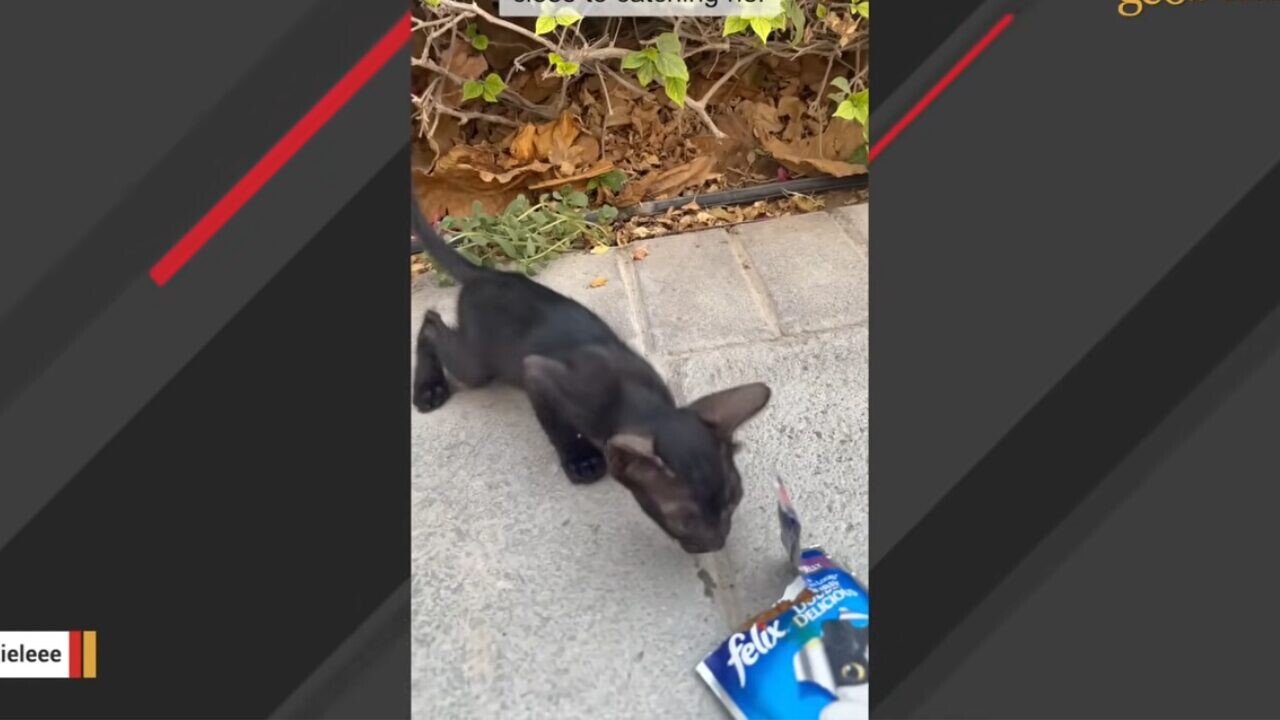 ニッキーさんは猫の保護活動のメンバーにもなっている動物好き。野良猫の多いドバイでかわいそうな猫を見つけたときのために、猫用のフードを持ち歩いていました。さっそくフードを与えて、おびき寄せます。飢えていた子猫はがつがつと食べますが、最初の捕獲は失敗。