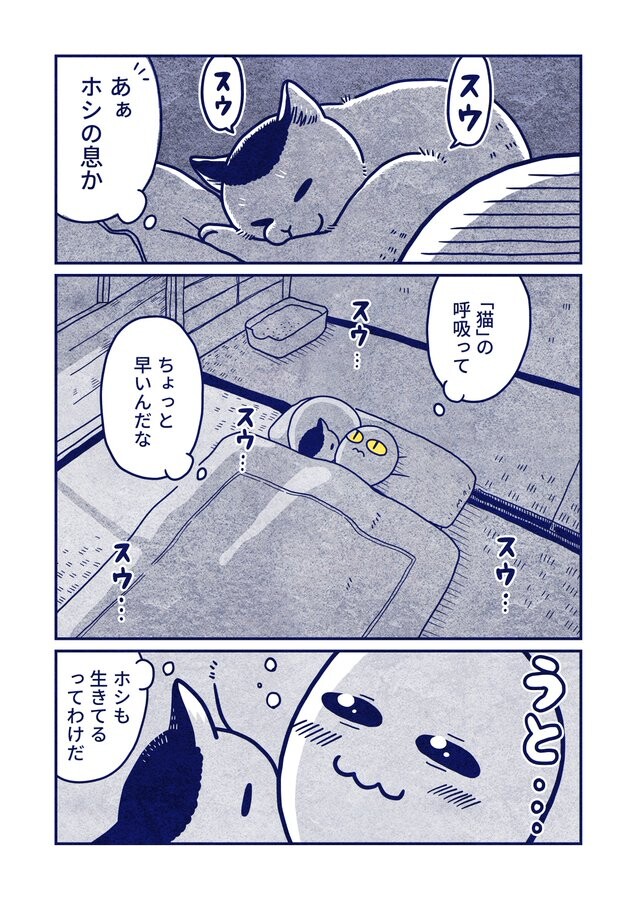 私自身、猫と暮らす中では一緒に寝る時が一番幸せを感じられるので、描きながら『クロヤン、よかったね』と思いました。