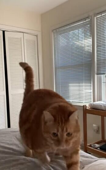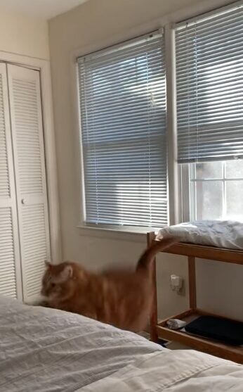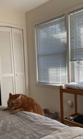 想定していた到達法とは違えど、無事、目的地に辿りついた猫ちゃんはベッド上にいる飼い主さんのもとへ。