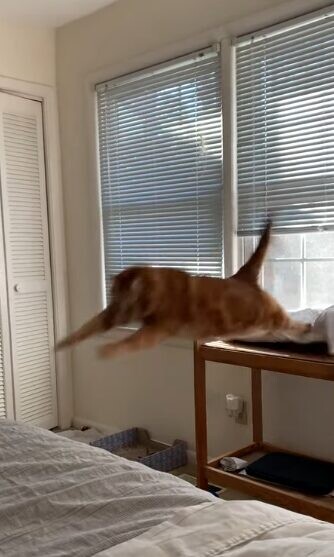 ふわふかの布団で、飼い主さんと一緒に眠りたい。そう思ったのか、猫ちゃんは勢いよくジャンプ!お気に入りの木製ワゴンから、ベッドに飛び移ろうとしました。