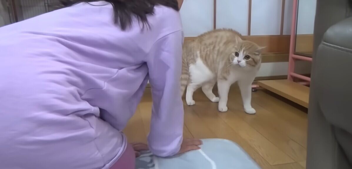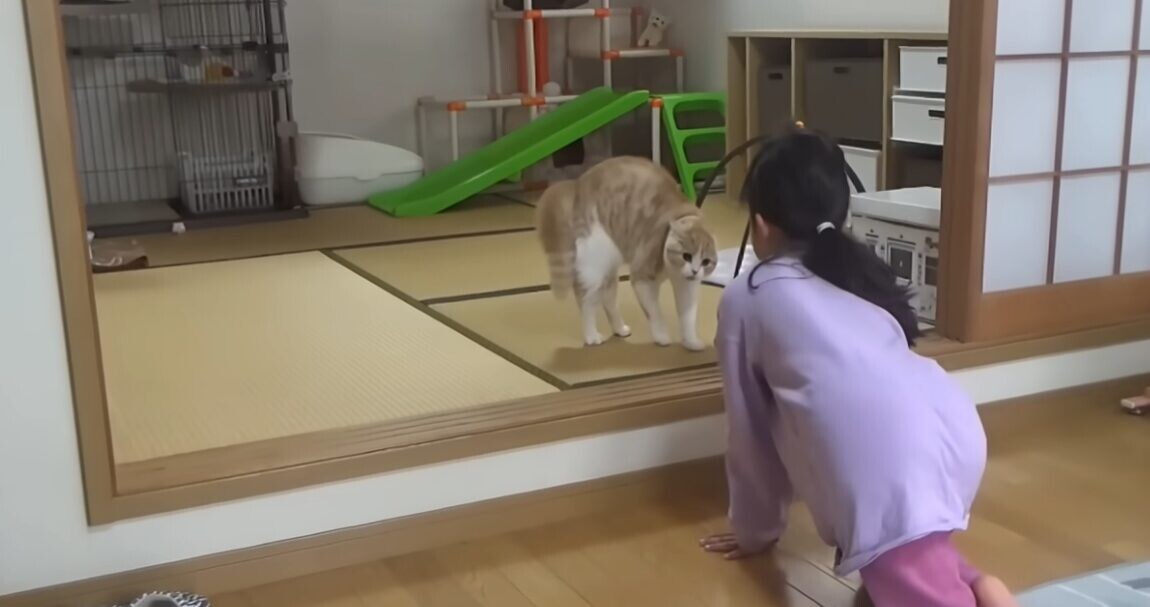 その後、ゆっくりと足を前に出し、慎重に娘さんのもとへ。娘さんも、きにゃこちゃんの行動に興味を持ち、自ら近づいていきます。