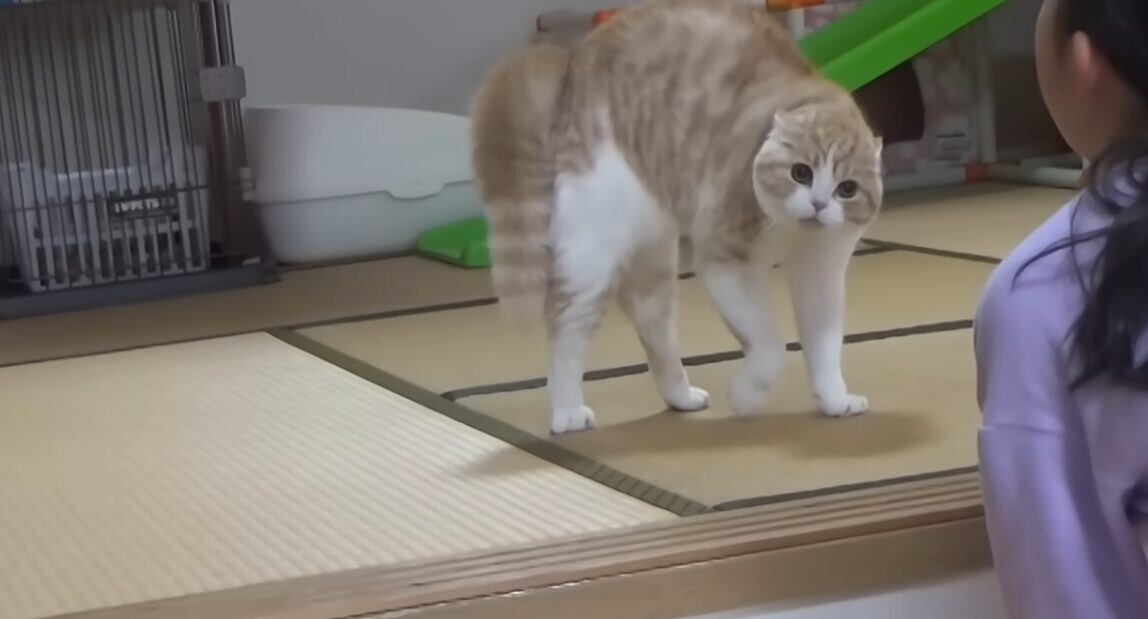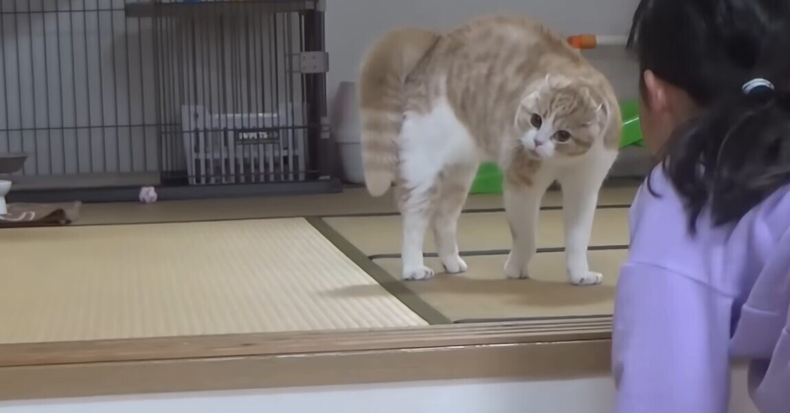 強気と警戒心が混ざっている猫の威嚇ポーズ「やんのかステップ」には、独特なユーモアがあります。投稿者さん宅では、スコティッシュフォールドの「きにゃこ」ちゃんが娘さんに対して、“やんのかステップ”を披露!果たして、ロックオンされた娘さんの反応は…?