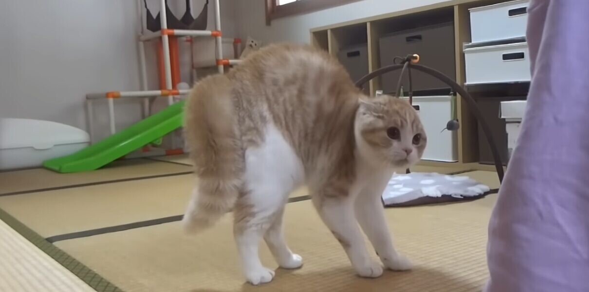尻尾を太くし、渾身の威嚇ポーズを見せるきにゃこちゃん。しばらくの間、硬直しながら娘さんの様子を伺っていました。