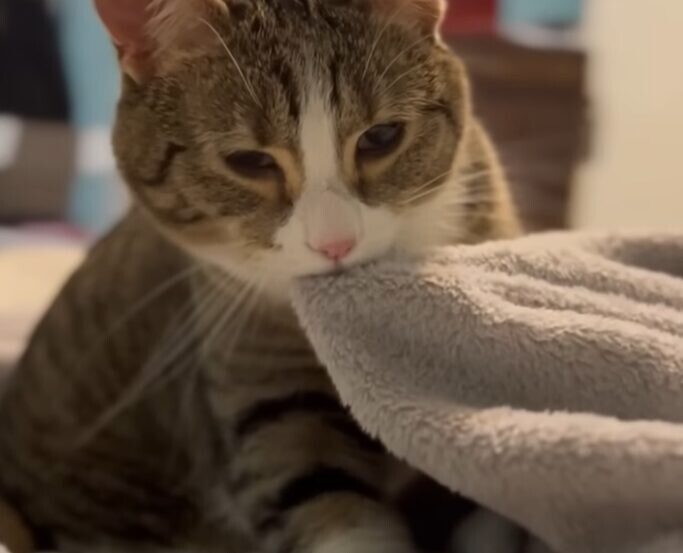 ルーちゃんは、ベッドの上にも自力で登れるよう。毛布を口に加えながらかわいいフミフミを披露してくれます。