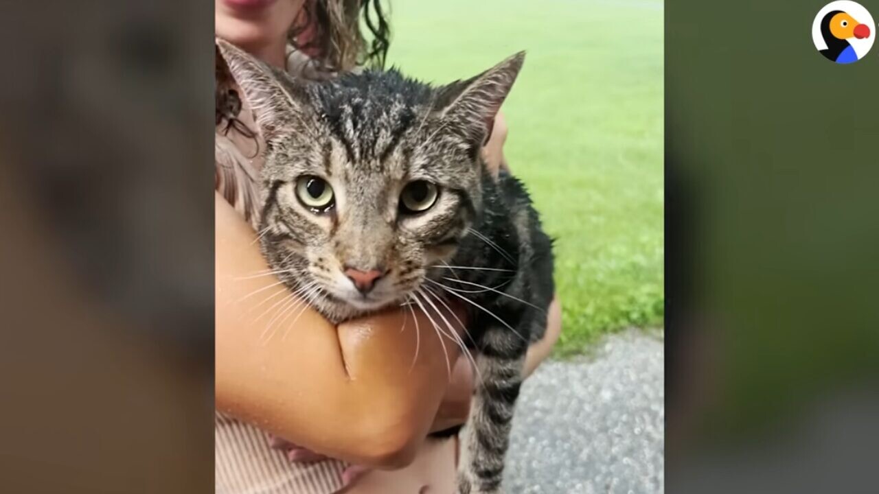 引っ越して数日たったある日、嵐がやってきました。イブさんがなんとなく大雨の窓の外に目をやると、キジ柄の猫が助けを求めて必死に鳴いていたのです。イブさんは濡れてしまうのもかまわず外に飛び出し、猫を抱き上げました。「この子、こんなに震えているわ」