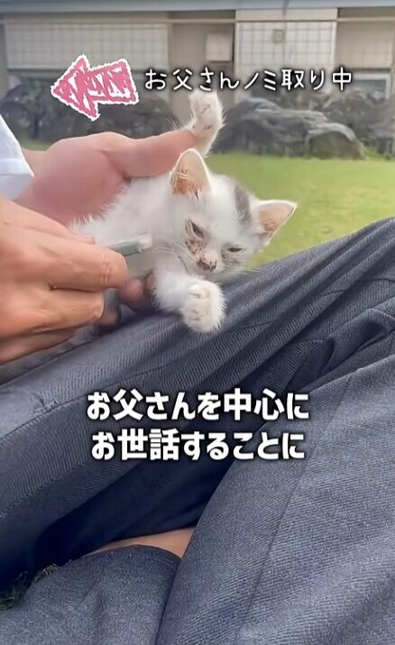 撮影者さんは子猫に「モモ」という名前を贈り、お父さんを中心としてお世話し始めました。お父さんにノミ取りをされている時、モモちゃんは気持ちよさそうな表情を見せます。