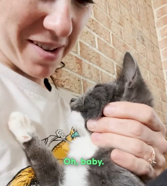 子猫は人懐っこく、女性に抱かれると手を出し、自らスキンシップを取ろうとします。そのかわいさに、女性は思わず笑顔になりました。