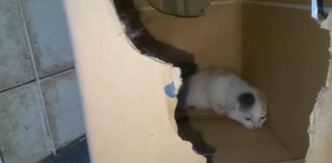 ミイコちゃんは食いちぎられたかのような段ボールに入っていたそう。それを見た飼い主さんは、複数匹で捨てられ、他猫たちは必死に脱走したのではないかと推測しました。