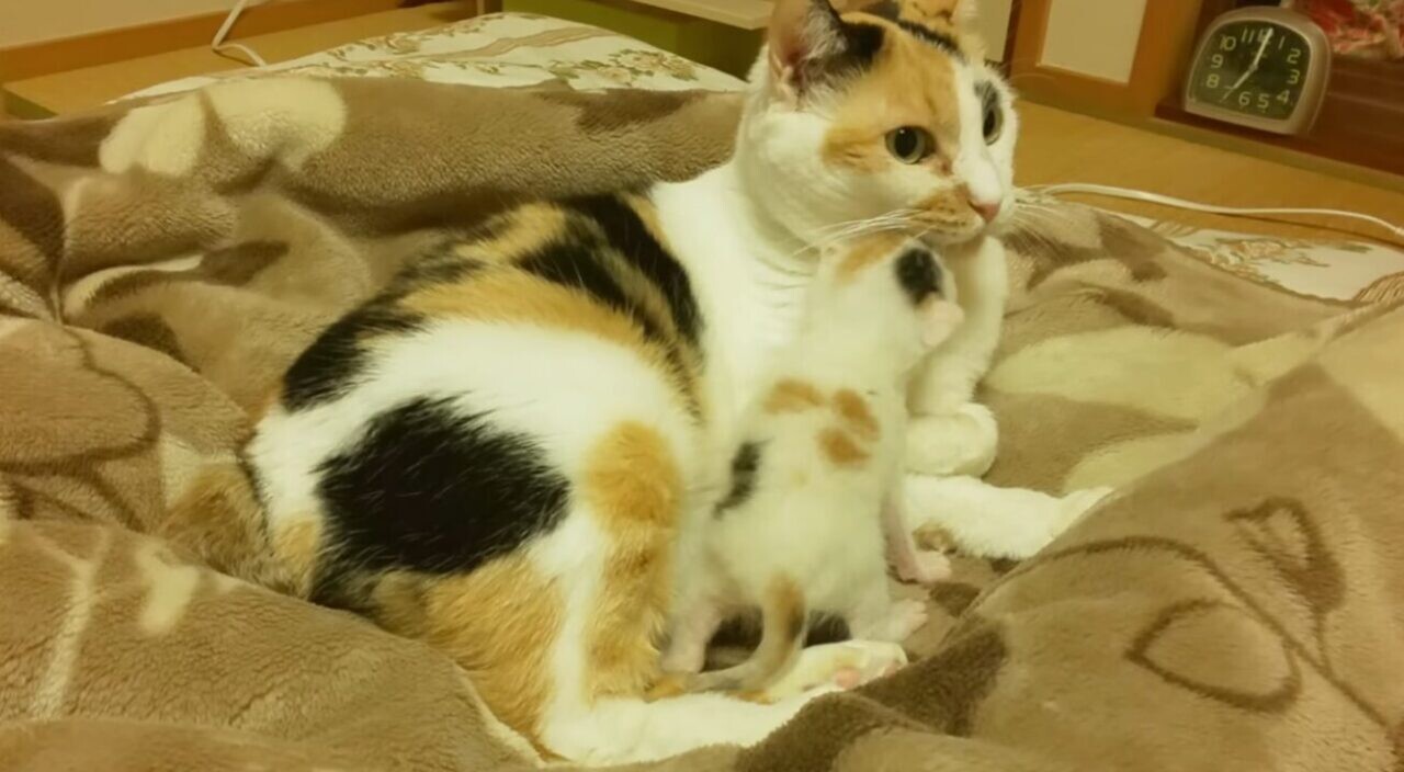 保護当時の体重は190g。先住猫たちもミイコちゃんに興味を示し、気づけば同じ三毛猫のいなちゃんと一緒に過ごす時間が増えていきました。