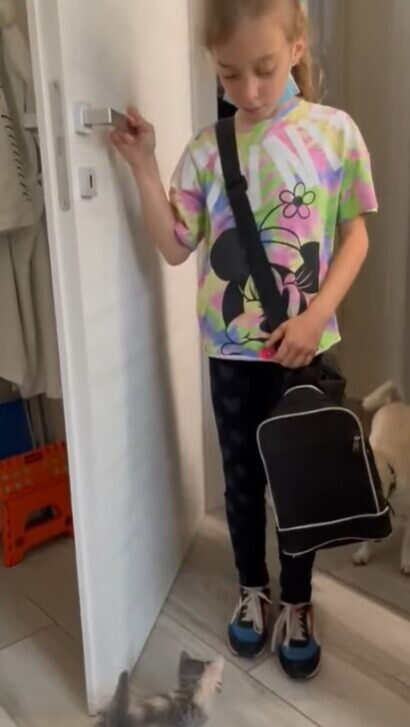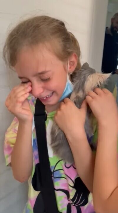 学校からの帰宅後、キキちゃんと初対面した娘さんは硬直。その後、ゆっくりしゃがみ、キキちゃんを抱き上げました。