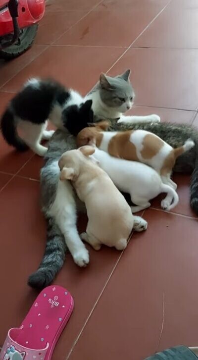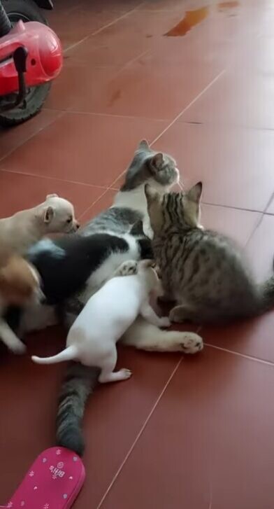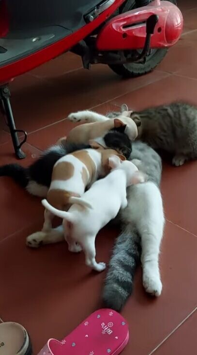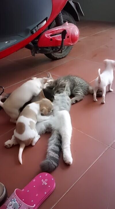 猫の母性は時に、種族の壁を越えて注がれることもあります。こちらの猫ちゃんは、自分の子どもではない子犬たちにも授乳。子犬たちの母親代わりとなってくれました。