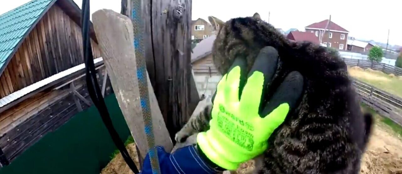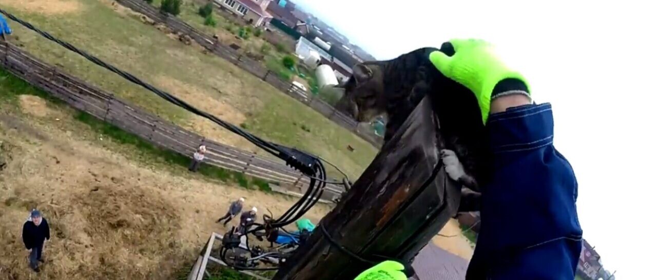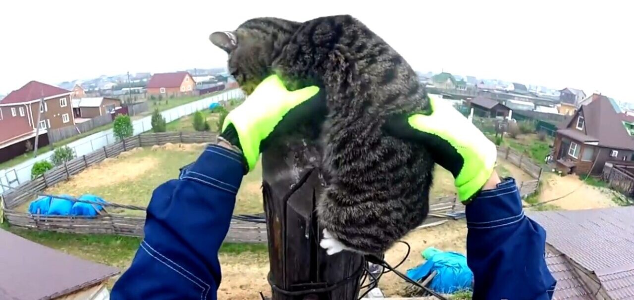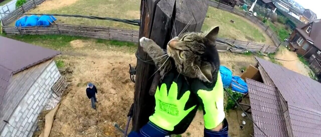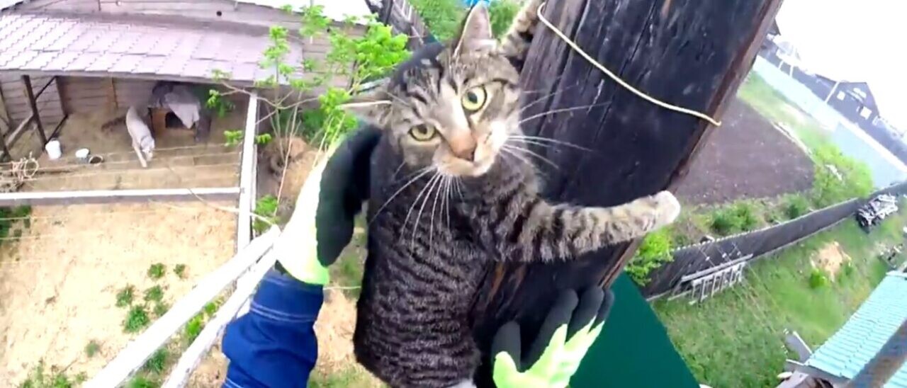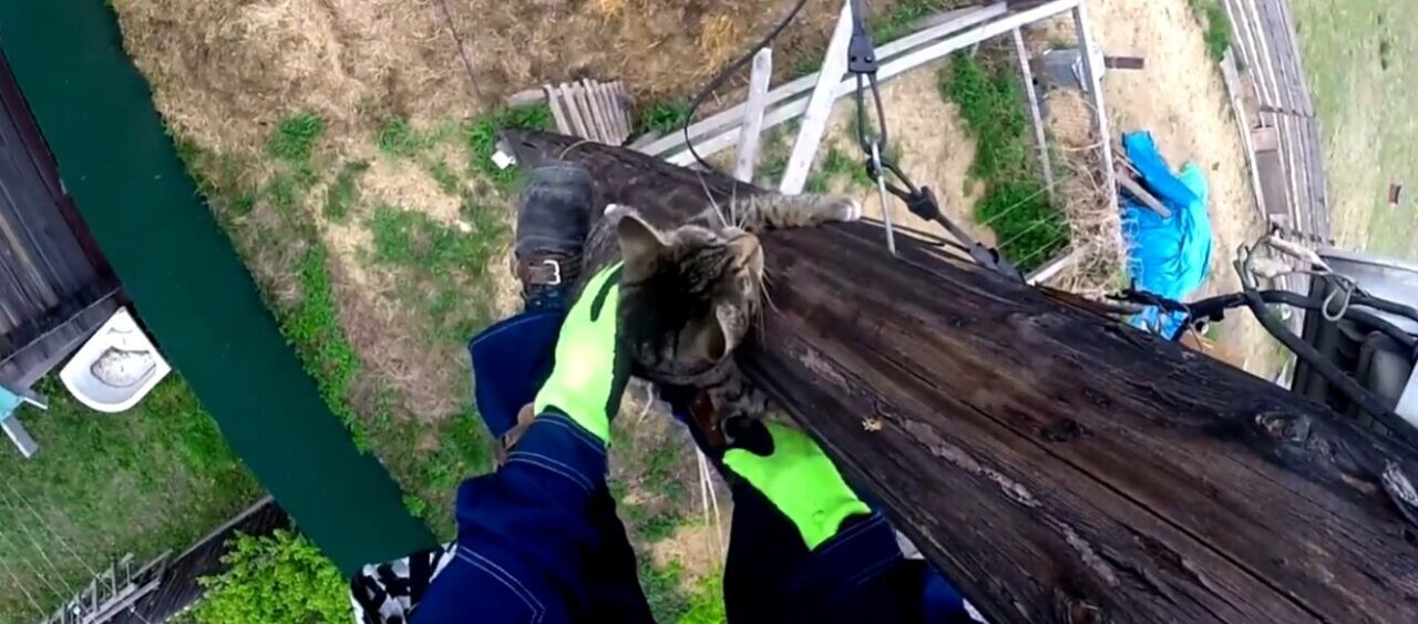 猫をレスキューする光景は、自然と手に力が入ってしまうもの。こちらの猫ちゃんは、電柱から降りられなくなってしまったよう。救助隊は、「ニャーニャ」と鳴きながらSOSを求める猫ちゃんを助けようと大奮闘しました。