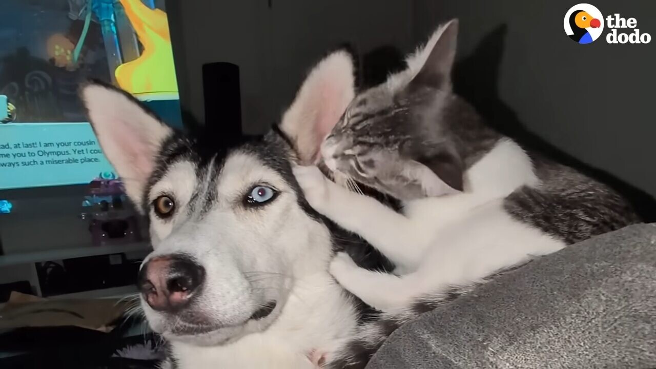子猫がチェスカさんをすぐに信頼しました。おもちゃでやんちゃに遊び、先住犬のハスキーとも仲良くなり、まるでずっとこの家にいたかのように自然になじんでいるのです。チェスカさんは、1日たたないうちに観念しました。「この子は手放せないわ。うちの子にします」