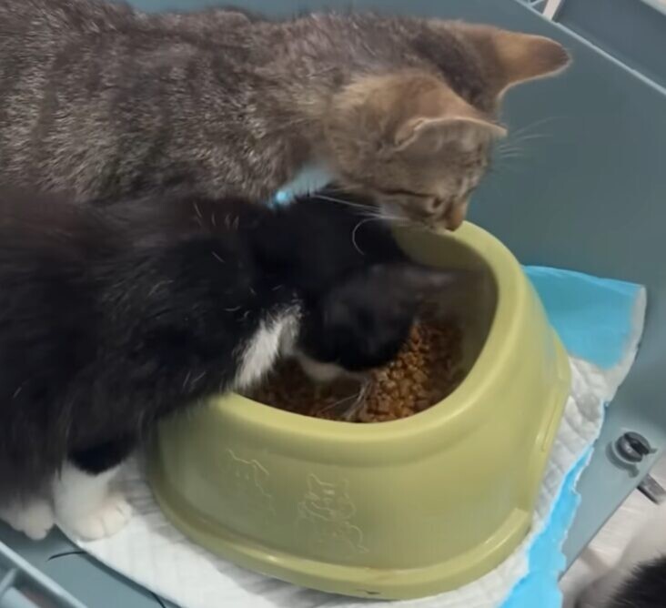 動物病院で子猫たちは駆虫薬を塗ってもらい、初めてのシャンプーも経験。慣れない環境の中で少し戸惑った様子を見せましたが、ご飯はガツガツと食べてくれました。