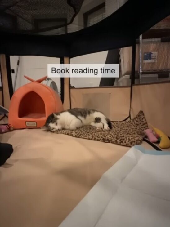 しかし、猫ちゃんは新しい環境になかなか慣れられず、ペットハウスの中に隠れてしまうことも…。そこで、女性はおやつを使って猫ちゃんを誘導、部屋の中が安全なことを覚えました。