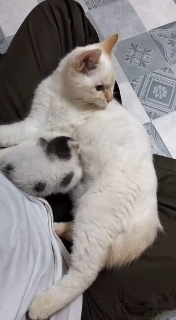 2匹は、血の繋がった親子ではありません。しかし、三毛猫ちゃんは子猫を我が子のように守り、育ててきました。子猫がミルクを欲しがると、そっと母乳を与える姿は、まさに母親です。