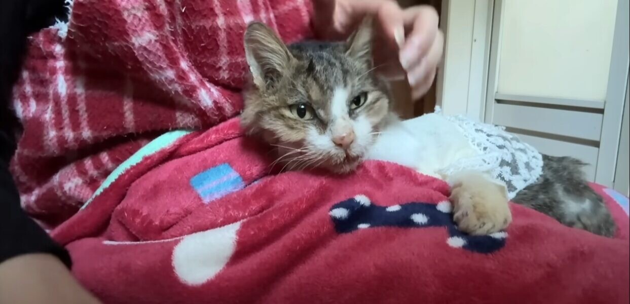 猫ちゃんは、推定12~13歳。男の子で体重はわずか、2.3kgでした。なお、猫エイズキャリアで、右の外ももと内ももの皮膚が切れていたそう。肝臓や腎臓、脾臓の状態もよくありませんでした。