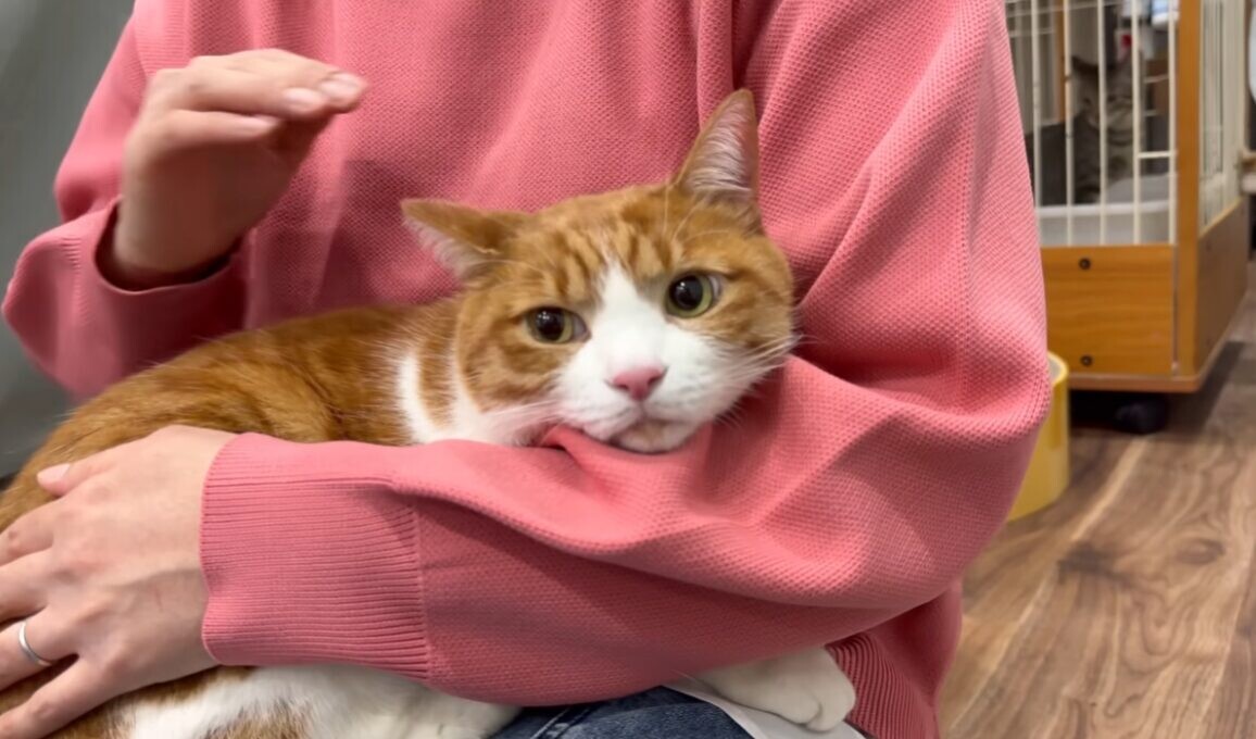 子猫の頃から元飼い主さんと暮らしていたからか、人間は怖くないよう。カンキチくんはスムーズに、投稿者さんの抱っこを受け入れてくれました。