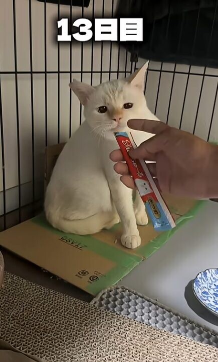 大きな変化が訪れたのは、保護から13日目のこと。おやつに夢中になっている時、初めて頬に触れることができたのです。