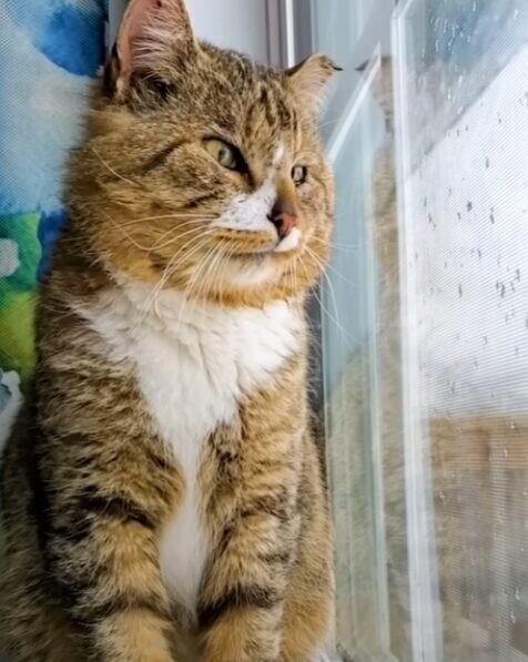 保護後、猫ちゃんはヒーターの上に座って窓の外を眺めることが日課に。お腹を撫でられるもの、へっちゃらです。