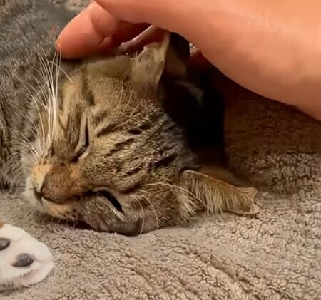 八重子さんの様子を見ながら、歯ブラシを孫の手に変えるなどして、人馴れ訓練を進める投稿者さん。手で撫でる時は、猫用おやつも強い味方になりました。