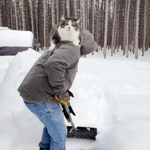 パパさんはレオくんを肩に載せて、器用に移動。掃除機をかけたり、雪かきをしたりし、黙々と作業をこなしていきます。